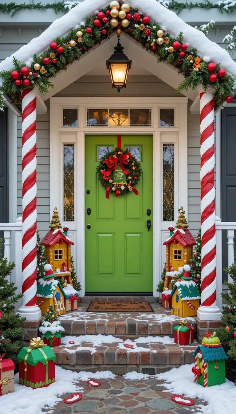 Reimagine your porch as the gateway to the North Pole with miniature elf houses and candy-striped posts. Use bright colors—lime green, red, and yellow—to capture the whimsy. Add tiny ladders, mailboxes, and elf footprints leading to the door. A “Santa’s Little Helpers Live Here” sign adds humor. It’s playful, fun, and utterly delightful.