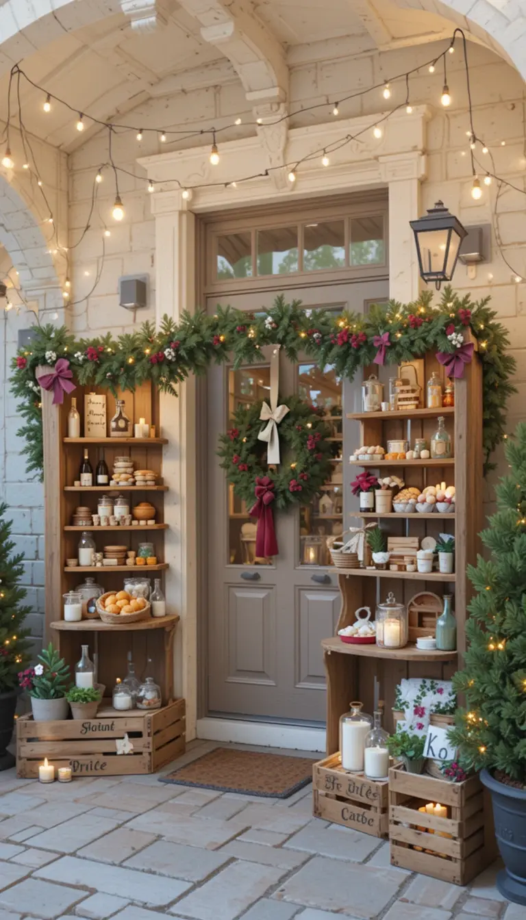 Turn your porch into a mini European-style Christmas market. Use wooden stalls or crates to display baked goods, candles, or ornaments. Hang strings of warm lights above. Add mulled wine spices or pine-scented candles for an aromatic touch. It’s a charming way to welcome guests with festive flair.