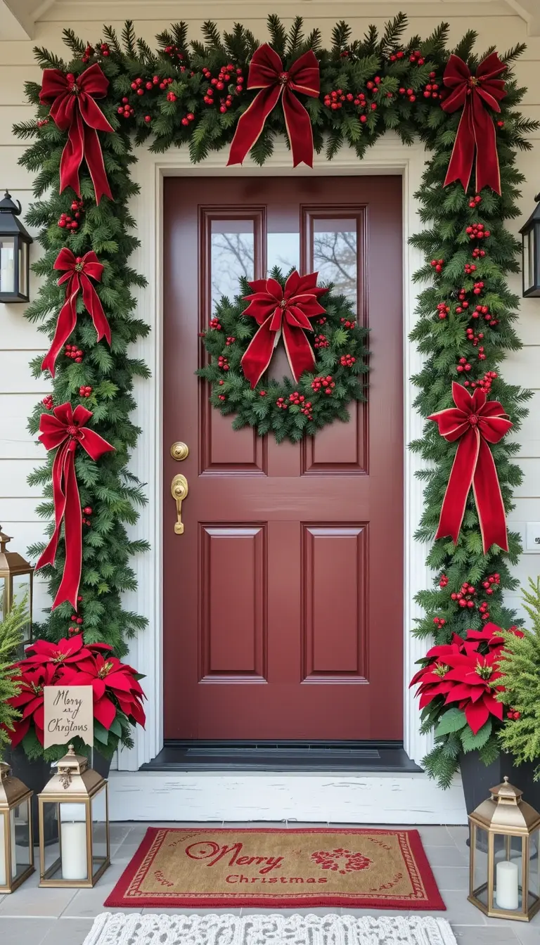 Sometimes traditional is best—use deep red poinsettias, lush garlands, and velvet ribbons. Frame your door with matching greenery and red berry accents. Add gold lanterns or candleholders for a touch of sophistication. A simple “Merry Christmas” sign in script font makes a charming statement. This timeless setup radiates warmth and holiday spirit.