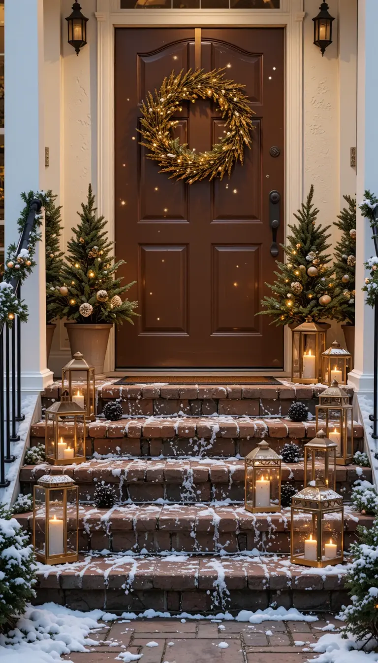 Line your porch steps with lanterns filled with flickering candles (real or battery-operated). Use gold, copper, or black metal for contrast. Add a wreath accented with mini candles for cohesion. The warm glow feels both romantic and inviting. It’s a perfect choice for quiet, snowy evenings.