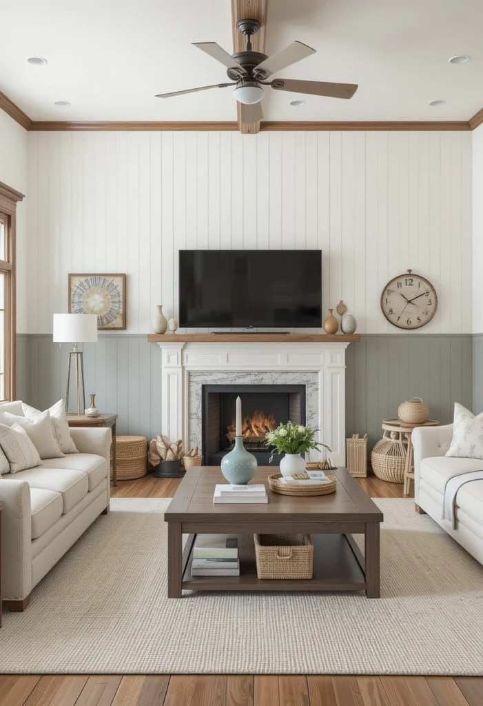 Board and batten remains one of the most popular farmhouse accent wall ideas with wood trim. Vertical battens evenly spaced across the wall create rhythm and structure. Soft white, greige, or muted sage paint colors enhance the cozy atmosphere. This style blends beautifully with linen sofas, woven baskets, and rustic coffee tables. It brings charm without feeling outdated.