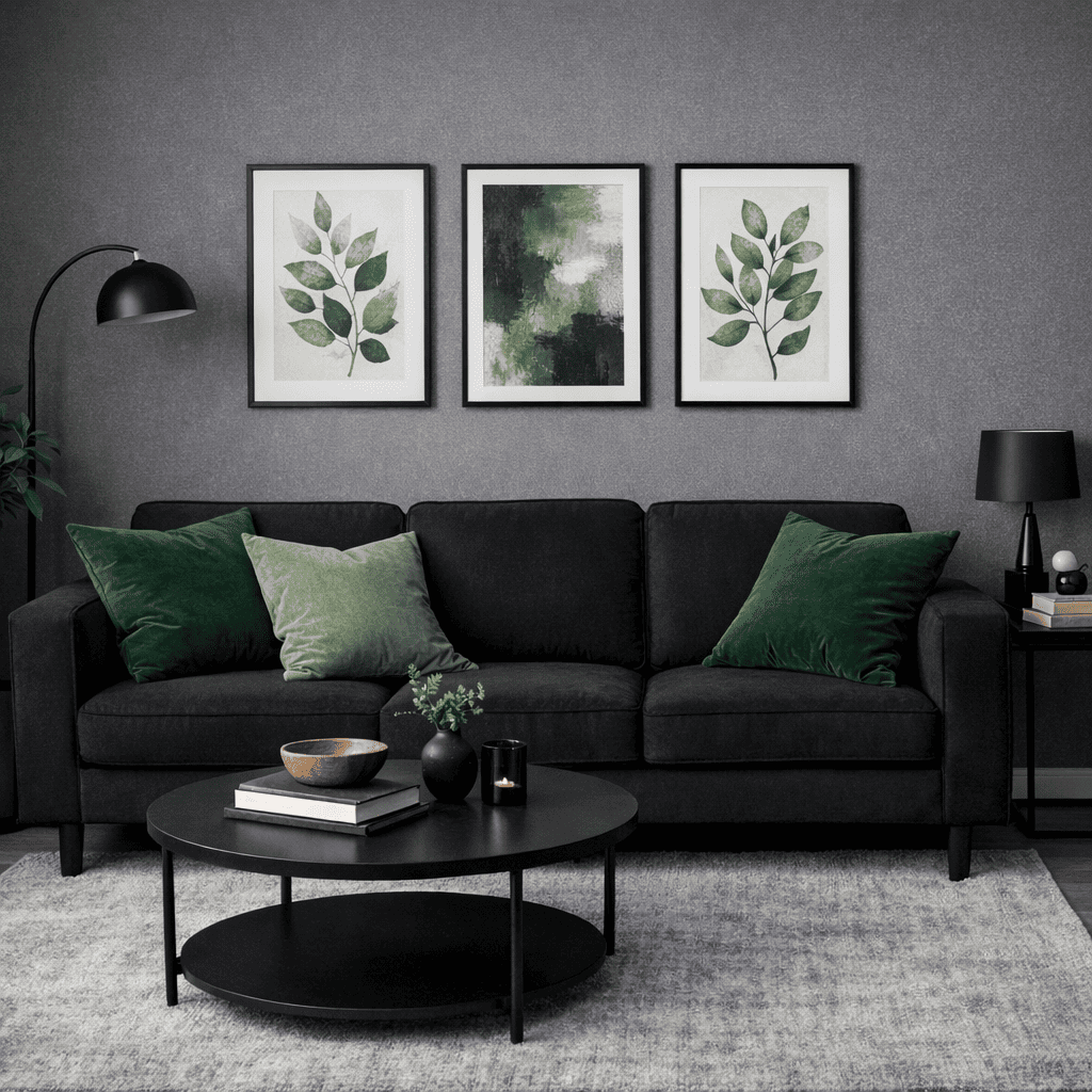 Wall art is where black and green can quietly shine together. Choose black frames with botanical prints or abstract green artwork to keep the palette intentional. This avoids the room feeling theme-heavy or overly literal.