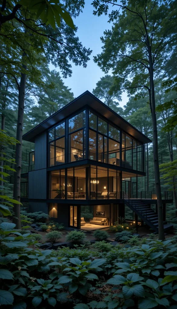 This exterior relies heavily on floor-to-ceiling glass walls that frame the forest like living artwork. The structure uses dark steel and concrete to contrast with the greenery, making the trees feel even more vibrant. Privacy is achieved not by fences, but by thoughtful orientation toward dense woodland. At night, the illuminated interior glows softly through the trees, creating a dramatic yet peaceful presence. This design works especially well in deep forest lots where visual connection matters more than street presence.