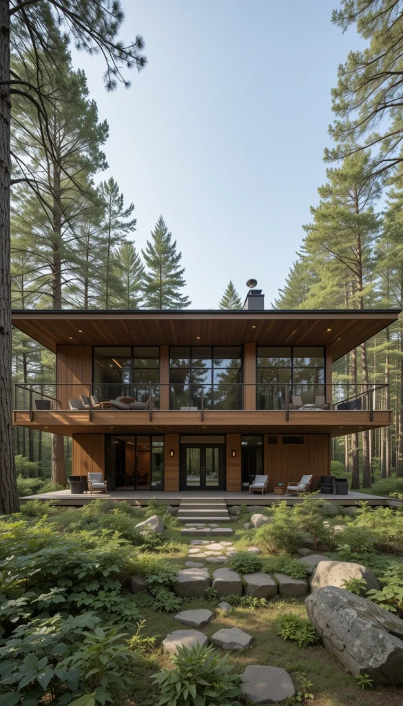 Tall vertical elements echo the height of surrounding trees. This creates visual harmony rather than competition. Narrow window groupings emphasize height without sacrificing warmth. The design feels elegant and composed. It’s especially effective in dense forests with mature trees.