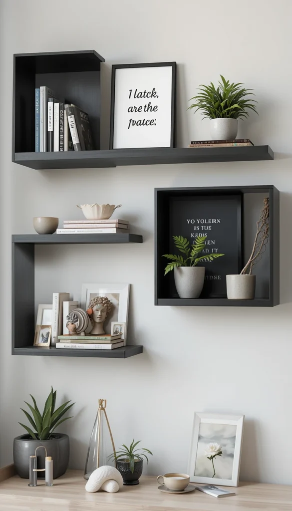 Floating shelves are both functional and stylish, offering a sleek way to display decor without cluttering your space. These modern shelves can hold a variety of objects — from books and plants to decorative sculptures. The key is to keep the arrangement clean and uncluttered, emphasizing simplicity and elegance. Opt for neutral-colored shelves, like matte black or natural wood, to ensure they blend seamlessly into your workspace.