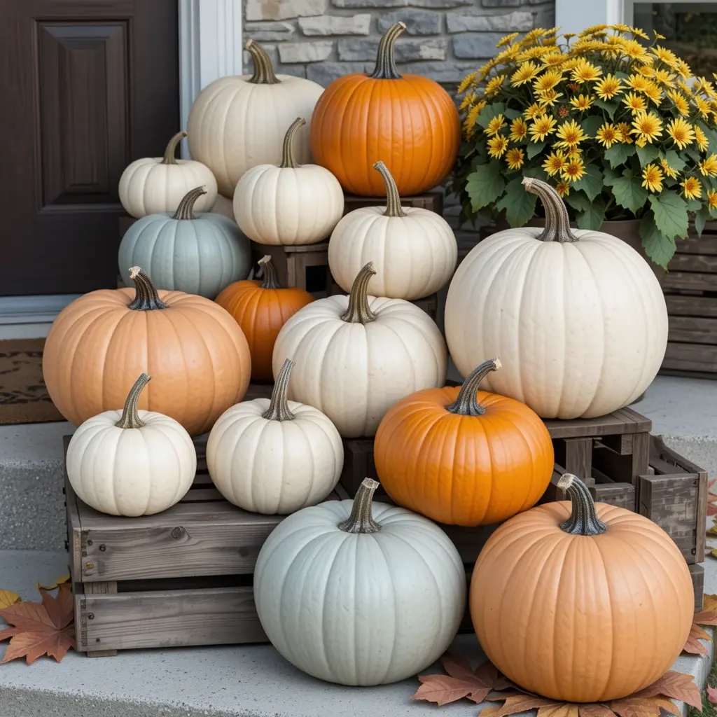 Start with the quintessential fall staple: pumpkins in varying sizes and colors. Group odd numbers of pumpkins together – three, five, or seven – for the most visually appealing arrangements. Mix traditional orange pumpkins with white, cream, and even blue-gray varieties for a sophisticated color palette. Place them on different levels using wooden crates, vintage stools, or your porch steps to create visual interest and depth.