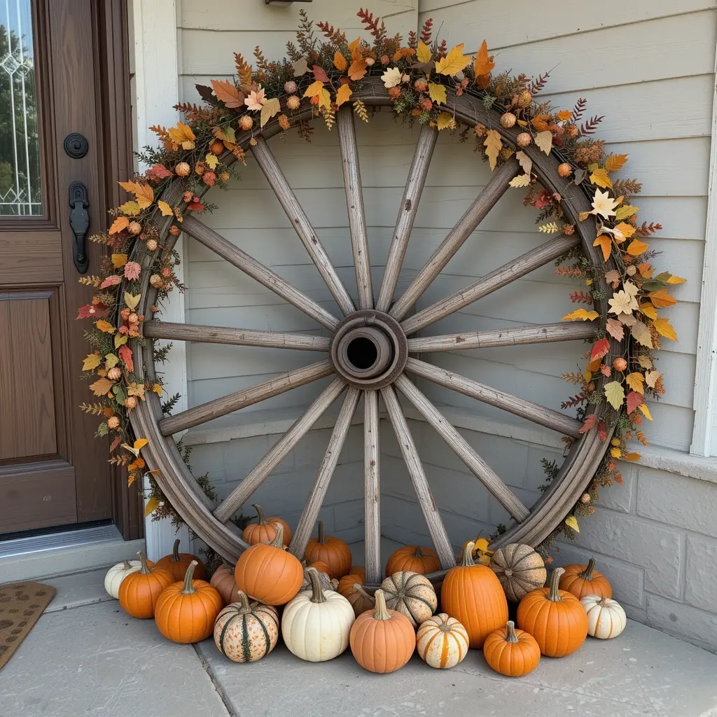 Incorporate vintage wagon wheels as unique focal points that add rustic character and create interesting circular design elements. Lean wheels against walls, use them as backgrounds for other decorations, or lay them flat as bases for seasonal arrangements. Decorate wheels with fall garlands, mini pumpkins, or seasonal signage to integrate them fully into your autumn theme. The weathered wood and metal add authentic country charm.