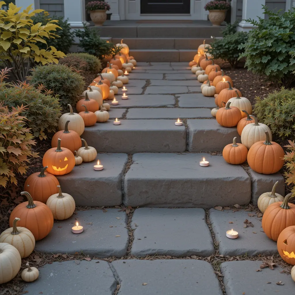 Line your walkway or porch steps with mini pumpkins to create a charming pathway that guides guests to your door. Use pumpkins in coordinating colors and sizes, spacing them evenly for a formal look or randomly for a more natural appearance. Add small battery-operated tea lights inside carved mini pumpkins for a magical evening glow. This simple technique creates major impact with minimal effort and expense.