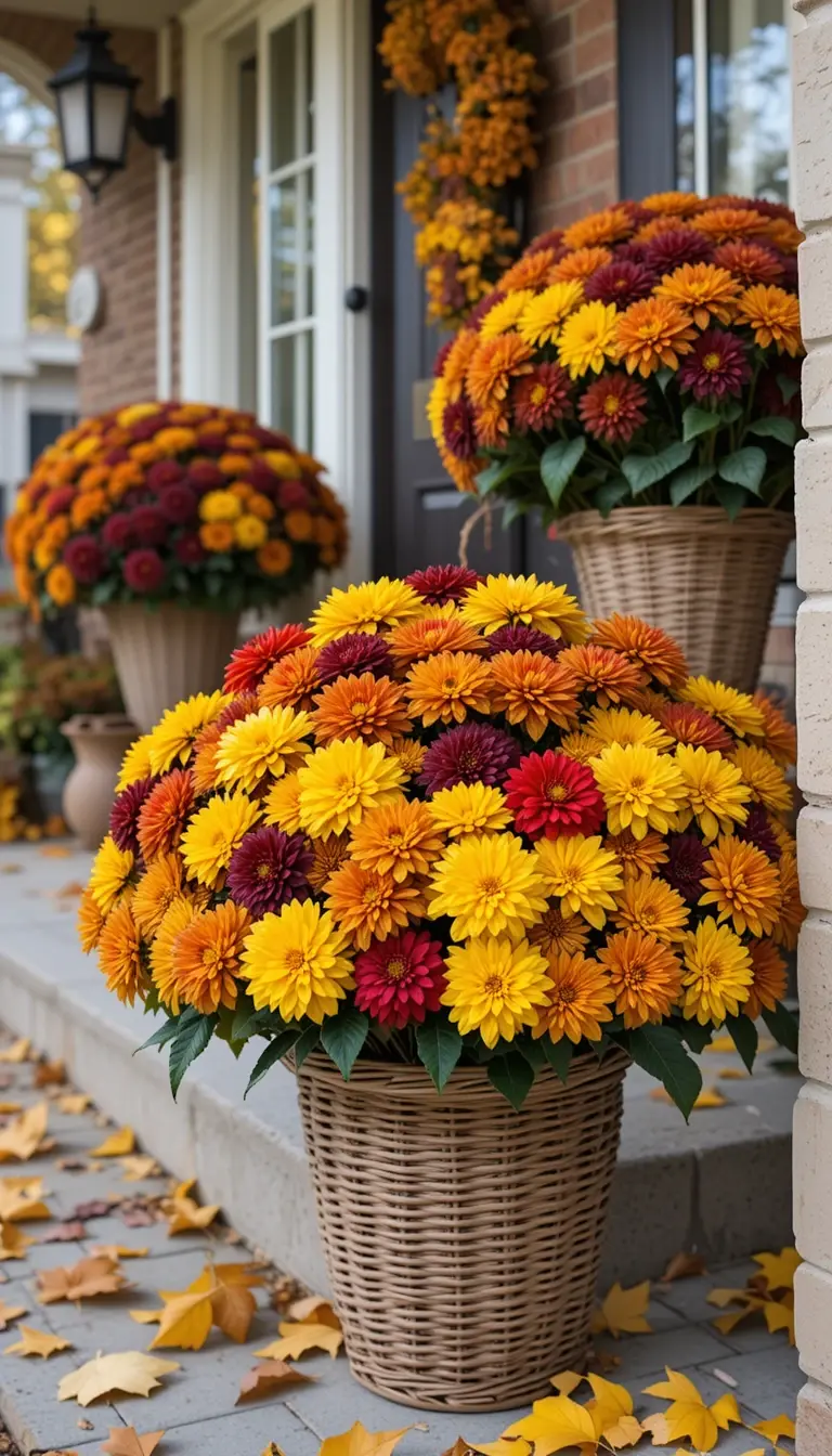 Chrysanthemums are fall’s workhorses, offering weeks of vibrant color with minimal maintenance requirements. Choose mums in rich burgundy, golden yellow, deep orange, and bronze tones to create a warm color scheme. Plant them directly in decorative containers or keep them in their nursery pots and nestle them inside larger planters for easy replacement. Position multiple mum arrangements at different heights around your porch entrance for maximum visual impact.