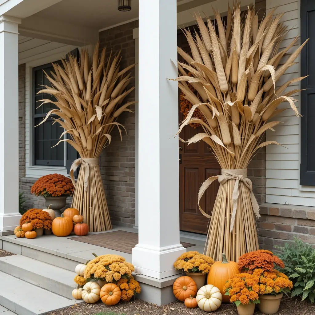 Create dramatic height and texture with bundles of corn stalks positioned at corners or flanking your front door. Tie stalks together with raffia or burlap ribbon, and lean them against porch columns or walls. Add coordinating decorations like pumpkins, gourds, or mums at the base of each bundle for a complete vignette. The tall, golden stalks add authentic farm-fresh appeal and create impressive vertical elements.