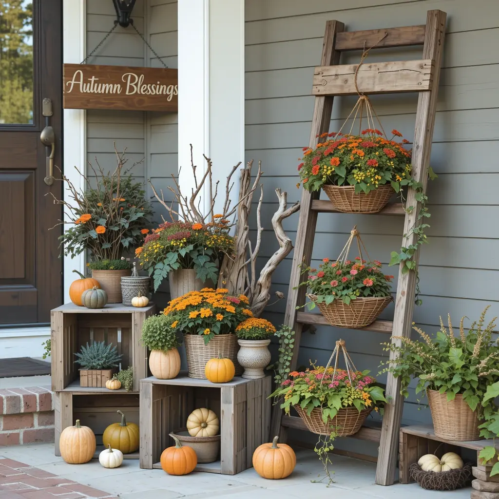 Incorporate natural wood elements to enhance the organic feel of your fall display. Use weathered wooden crates as planters or display stands, lean vintage wooden signs against walls, or add a rustic wooden ladder to showcase hanging baskets. Reclaimed barn wood, driftwood, or even fallen branches can add authentic rustic charm. The natural texture of wood pairs beautifully with fall’s organic color palette and creates a cohesive outdoor design.
