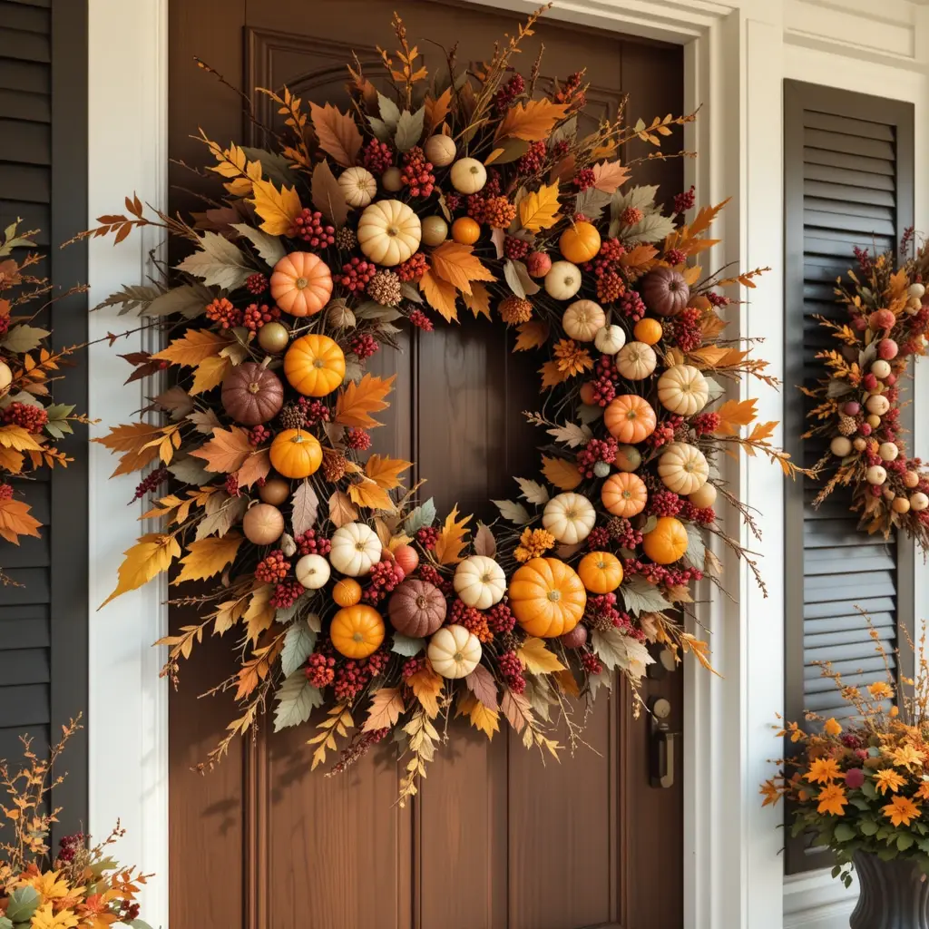 Make a bold statement with an oversized fall wreath that becomes the focal point of your porch decoration. Choose wreaths made from natural materials like grapevine, twig, or eucalyptus, then embellish with seasonal elements. Layer in artificial fall leaves, mini pumpkins, pinecones, and berries for a full, luxurious appearance. Don’t limit yourself to just the front door – hang wreaths on shutters, gates, or even porch columns.