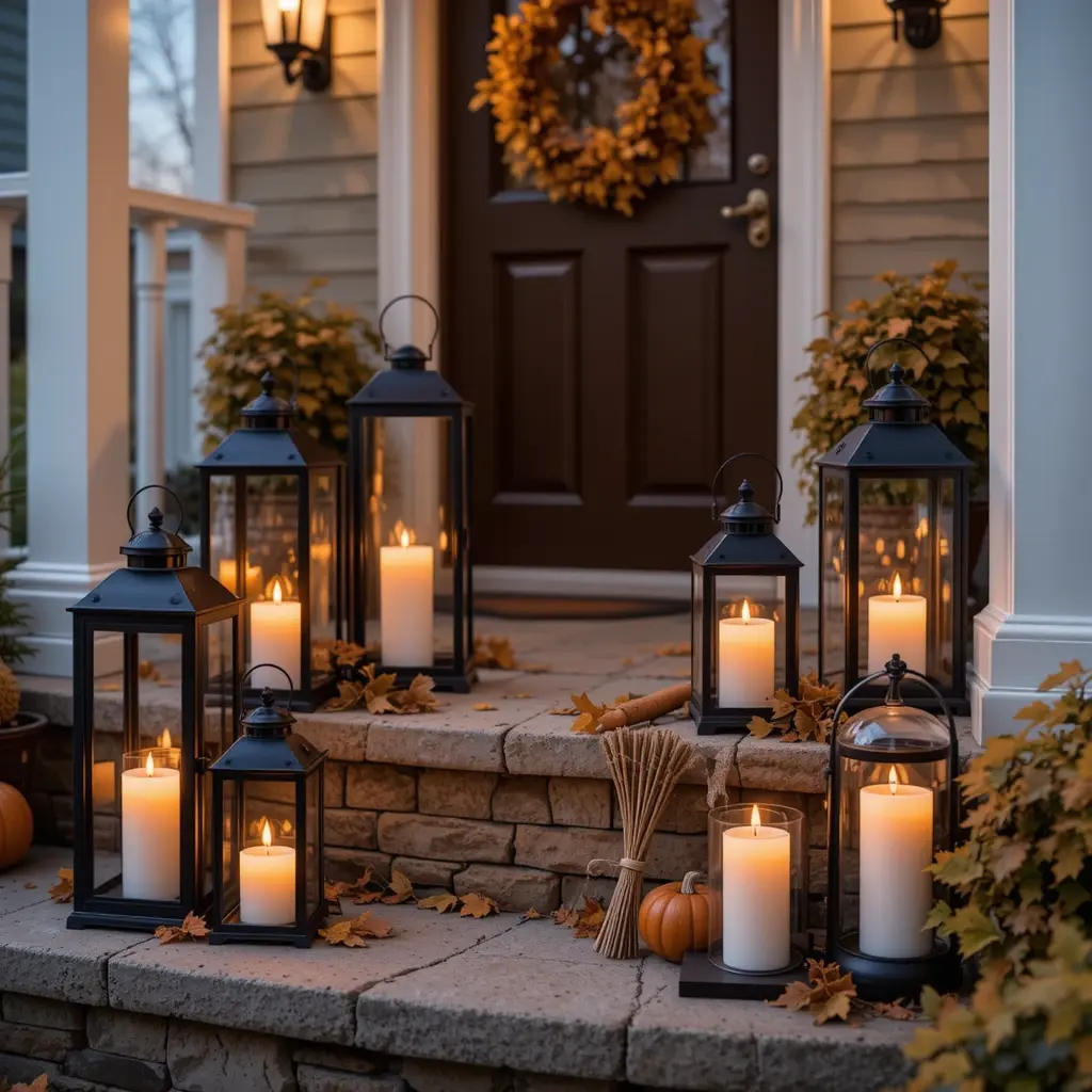 Illuminate your porch with warm, flickering light using lanterns and candles that create a magical autumn ambiance. Use battery-operated candles in glass hurricane lanterns for safety, or opt for real candles in enclosed fixtures. Group lanterns of different sizes together and place them on tables, steps, or hang them from porch ceilings. Add some cinnamon or apple-scented candles to engage multiple senses with fall fragrances.
