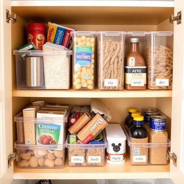 Clear bins keep categories contained while still letting you see what you own. Snacks, baking supplies, and packaged goods stay grouped instead of spreading out across shelves. In a small cabinet, visual clarity reduces that overwhelmed feeling. I love labeling bins for even more structure — it turns chaos into a system. And when everything has a “home,” tidying up becomes effortless.