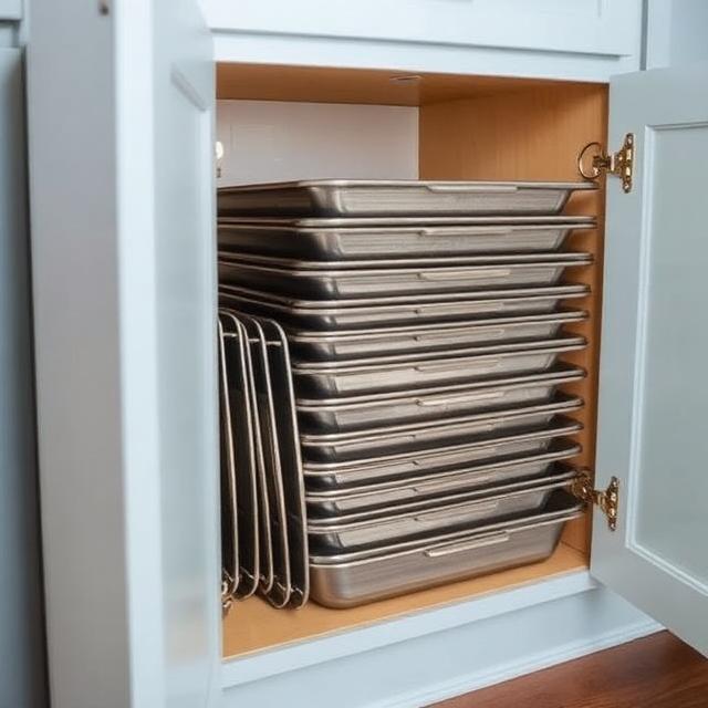 Stacked baking sheets are noisy and frustrating. Vertical dividers allow you to slide trays in like files instead of piling them flat. This not only saves space but also protects your cookware from scratches. It’s a small structural tweak that dramatically improves accessibility. In compact kitchens, easy access matters more than anything.