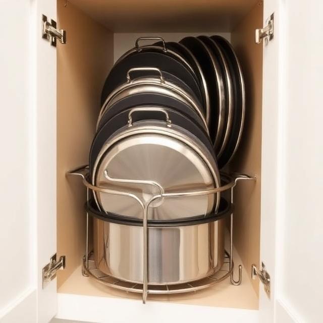 Pot lids are awkward and take up disproportionate space. Storing them upright in a rack — especially mounted on a cabinet door — frees up room for nesting pots neatly. This method creates breathing room in tight cabinets. It also prevents the avalanche effect when you pull one pan out. Organized lids are a surprisingly satisfying win.