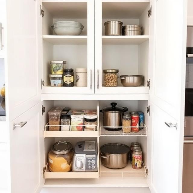 Deep cabinets can become black holes where items disappear. Pull-out organizers solve that instantly by bringing everything forward with one smooth motion. They’re especially helpful for pots, small appliances, or pantry items. Instead of kneeling and digging, you simply slide and grab. In small kitchens, convenience equals efficiency, and efficiency makes the space feel bigger.