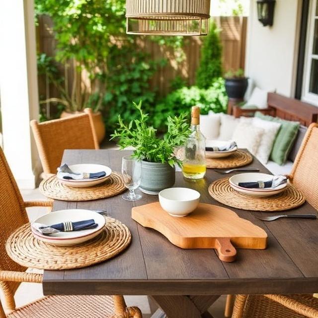 Texture keeps the space from feeling flat. Woven placemats, rattan chargers, wooden serving boards, and ceramic dishes add depth. Mixing materials makes the setting feel curated. Outdoor spaces thrive when they echo nature. Layered textures create warmth without clutter.