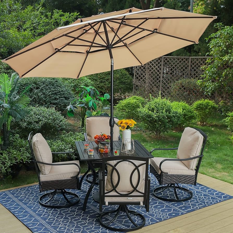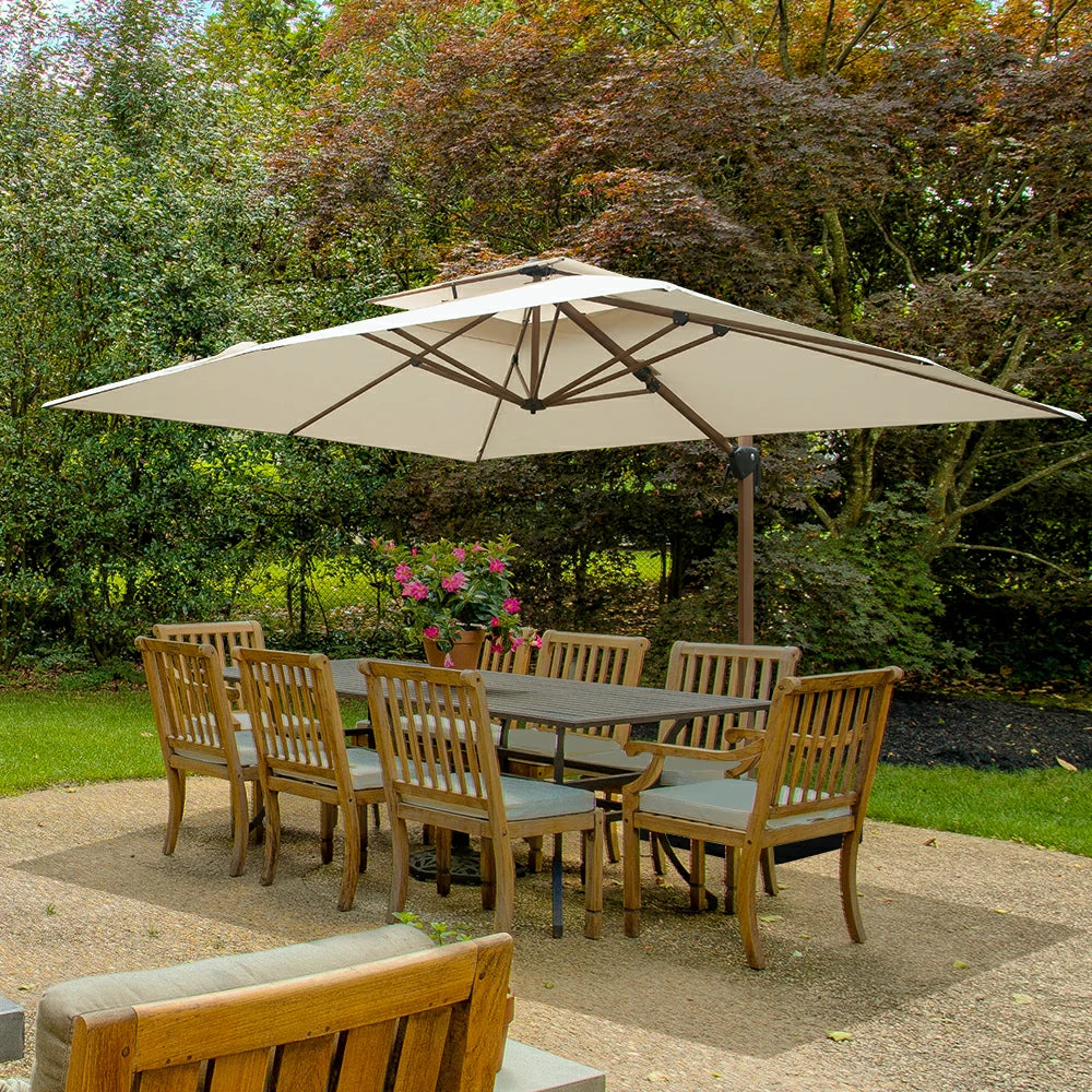 Not ready for a pergola? A large umbrella works beautifully. Choose one that’s wide enough to shade the entire table rather than just the center. Neutral tones feel timeless, while subtle stripes add playful summer energy. A cantilever style keeps the pole out of the way for easier seating. Proper shade extends usability, especially in hot climates.