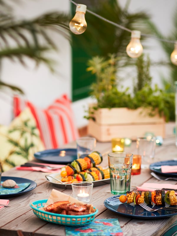 String lights are a summer classic for a reason. They cast a soft glow that flatters everyone and creates instant ambiance. Drape them across a pergola, fence, or overhead wire to frame the dining area. The key is warm-toned bulbs, not bright white. Lighting sets the emotional tone of the space, especially after sunset.