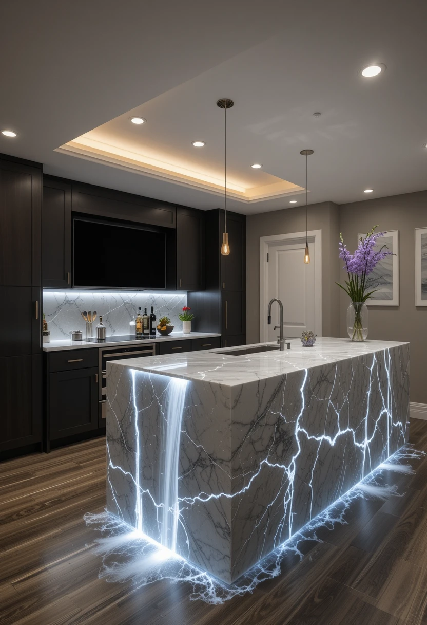 A marble island instantly elevates the basement bar into a luxury feature. The bold veining in the stone adds natural artistry that makes the island feel custom and high-end. Sculptural bar stools introduce a design-forward element that feels more like modern furniture than simple seating. Pendant lighting above the island highlights the marble surface beautifully. The overall result is a basement bar that feels sophisticated, stylish, and unforgettable.