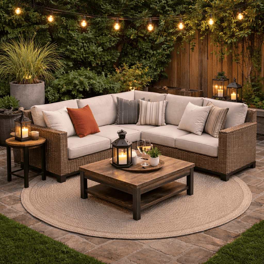 Begin by pushing an L-shaped outdoor sectional into a corner to define the seating zone. Add a side table at one end so drinks and books have a place to land. Layer in outdoor cushions to soften the structure and make it feel relaxed. This arrangement naturally blocks wind and creates a sense of enclosure. It’s ideal for families who want a casual, lounge-style layout.