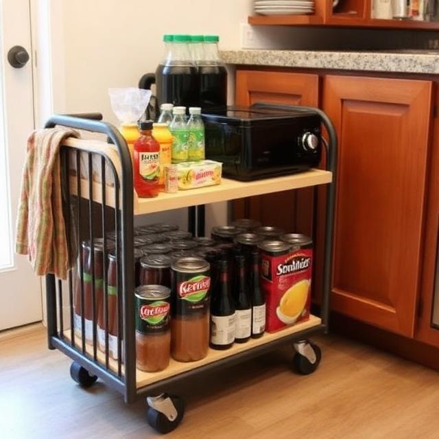 Rolling carts offer flexible storage when pantry space runs out. They’re great for appliances, beverages, or bulk purchases. You can move them where needed, then tuck them away. This is ideal for apartments or shared kitchens. Mobility adds versatility.