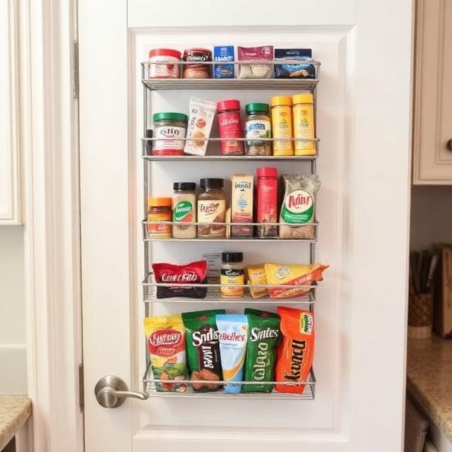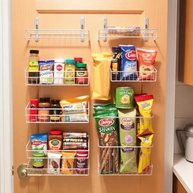 The back of the pantry door is often wasted space. Slim racks can hold spices, snacks, or wraps without crowding shelves. This is ideal for small kitchens where every inch matters. Door storage keeps frequently used items within reach. It’s a smart way to expand storage without remodeling.