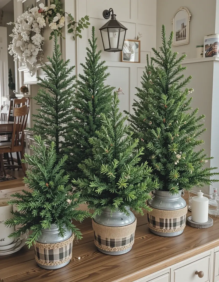 Instead of one big tree, scatter small evergreens around your home in vintage crocks or metal pails. Wrap the bases in burlap or plaid fabric for a finished look. This creates a forest-like feeling that’s both quaint and inviting. They fit perfectly on entry tables, countertops, or porches. It’s a great way to add greenery to every corner.