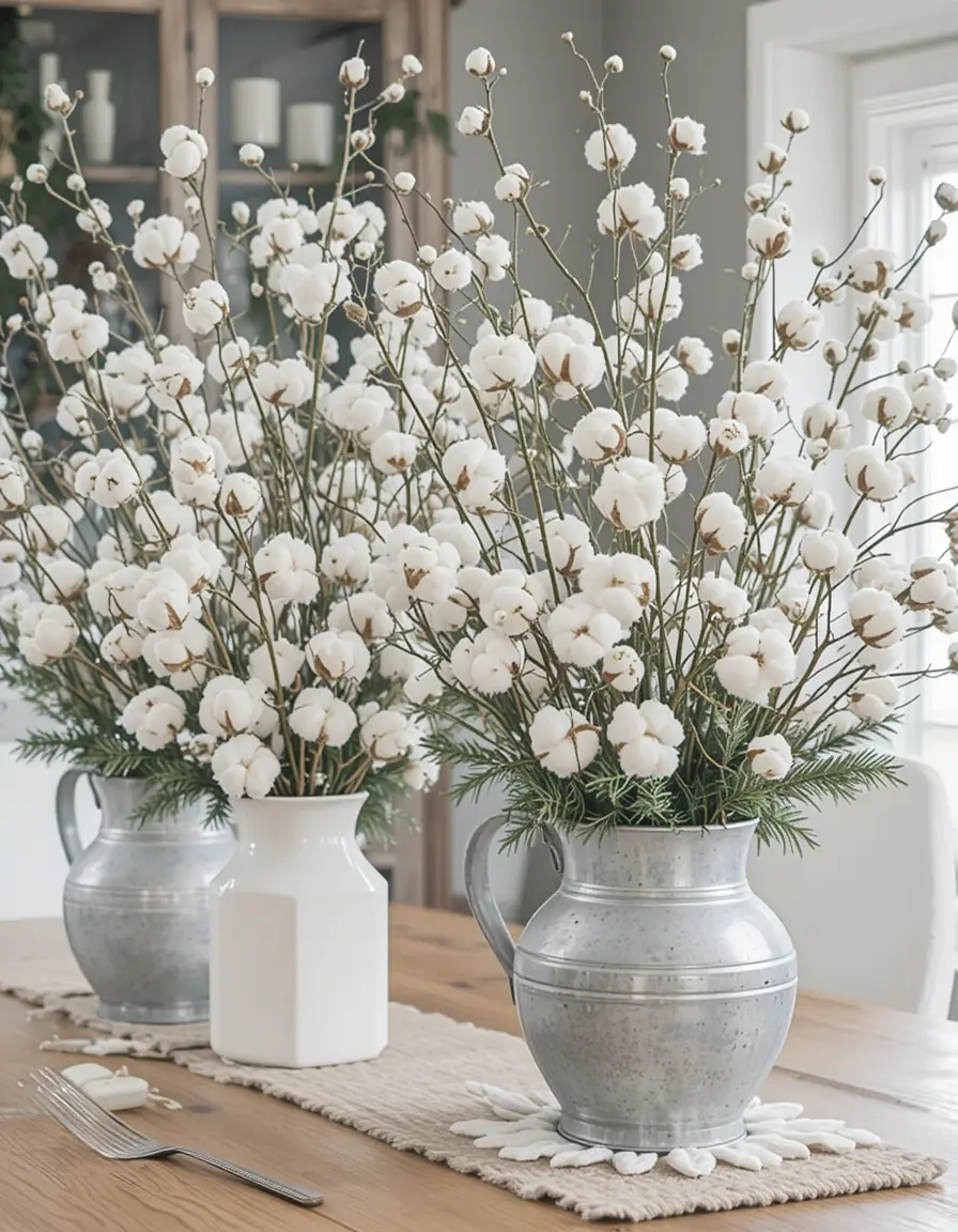 Replace traditional floral arrangements with cotton stems and pine branches. The white cotton adds a snowy softness against dark greens. Use galvanized pitchers or stoneware jugs as vases. It’s an understated yet elegant farmhouse twist on holiday florals. The neutral palette complements any rustic setting.