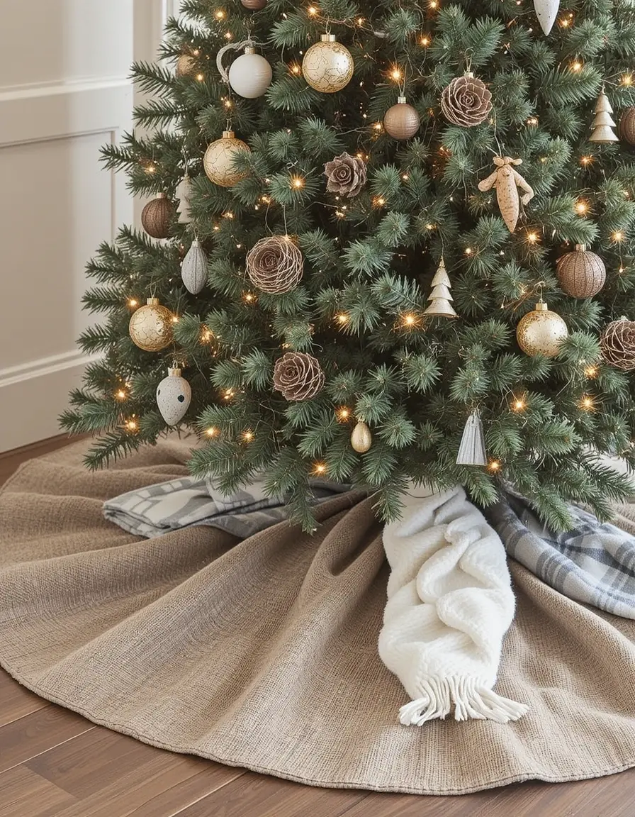 Choose a tree skirt made of burlap, linen, or quilted fabric. Avoid sparkly or sequined styles—natural materials look more authentic. The texture grounds your tree in a cozy, country aesthetic. Add layered plaids or cable-knit blankets for extra warmth. It subtly enhances the overall farmhouse feel of your tree setup.