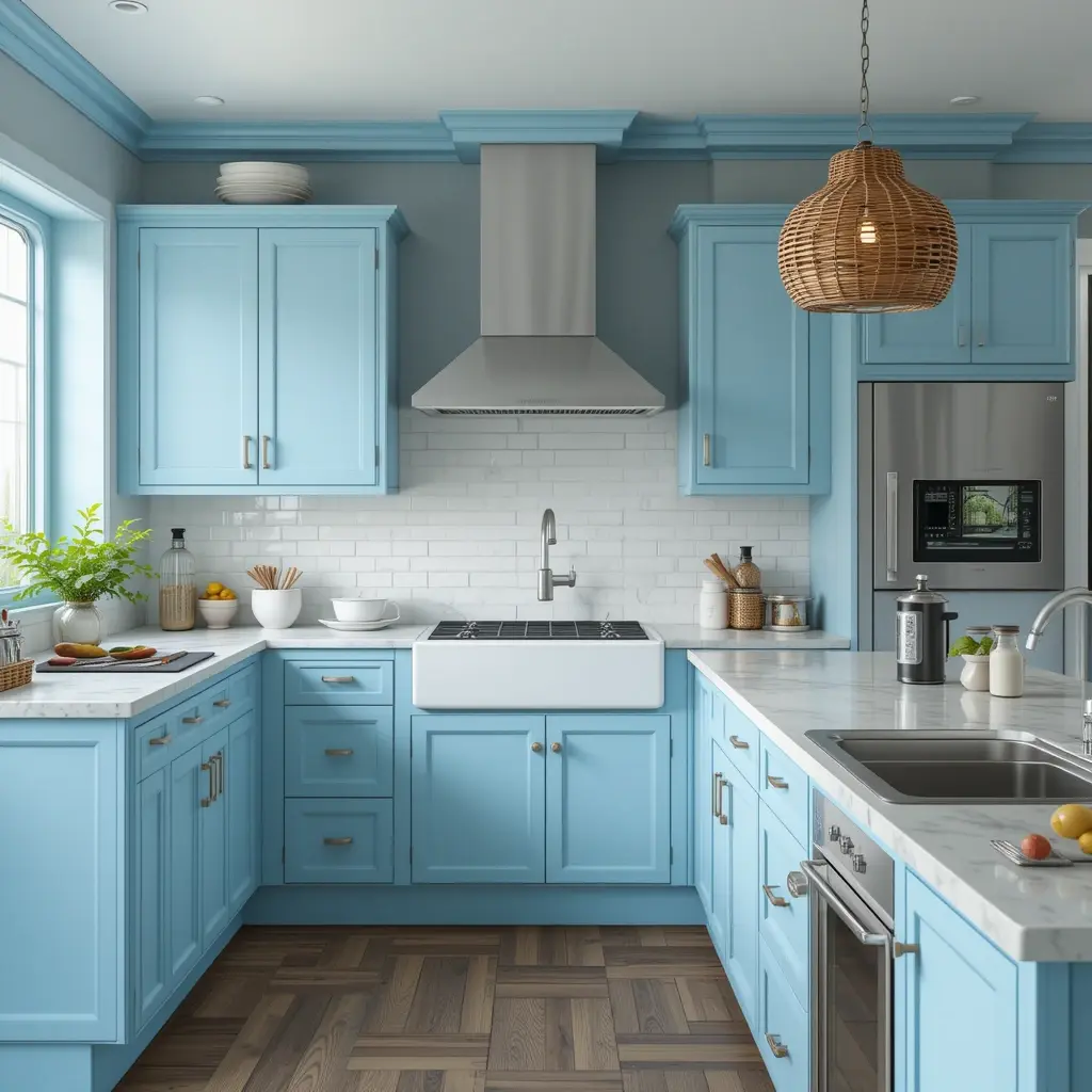 Sky blue evokes a sense of openness and tranquility, making your kitchen feel airy and inviting. It’s a great choice for cabinets or walls, especially in smaller spaces. Combine it with white or light gray for a fresh, clean look. This hue pairs well with natural textures like wicker or rattan. Expect a calming environment that’s perfect for family mornings.