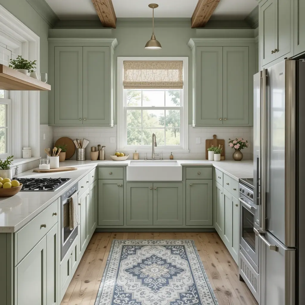 Sage green gives your kitchen a calm, organic feel, perfect for creating a relaxing environment. It pairs nicely with white or light wood cabinetry, adding a touch of nature indoors. Use it on cabinets or as an accent wall to infuse subtle color without overwhelming the space. This hue is especially popular in farmhouse or rustic-inspired kitchens. Expect a soothing atmosphere that invites you to unwind after a busy day.