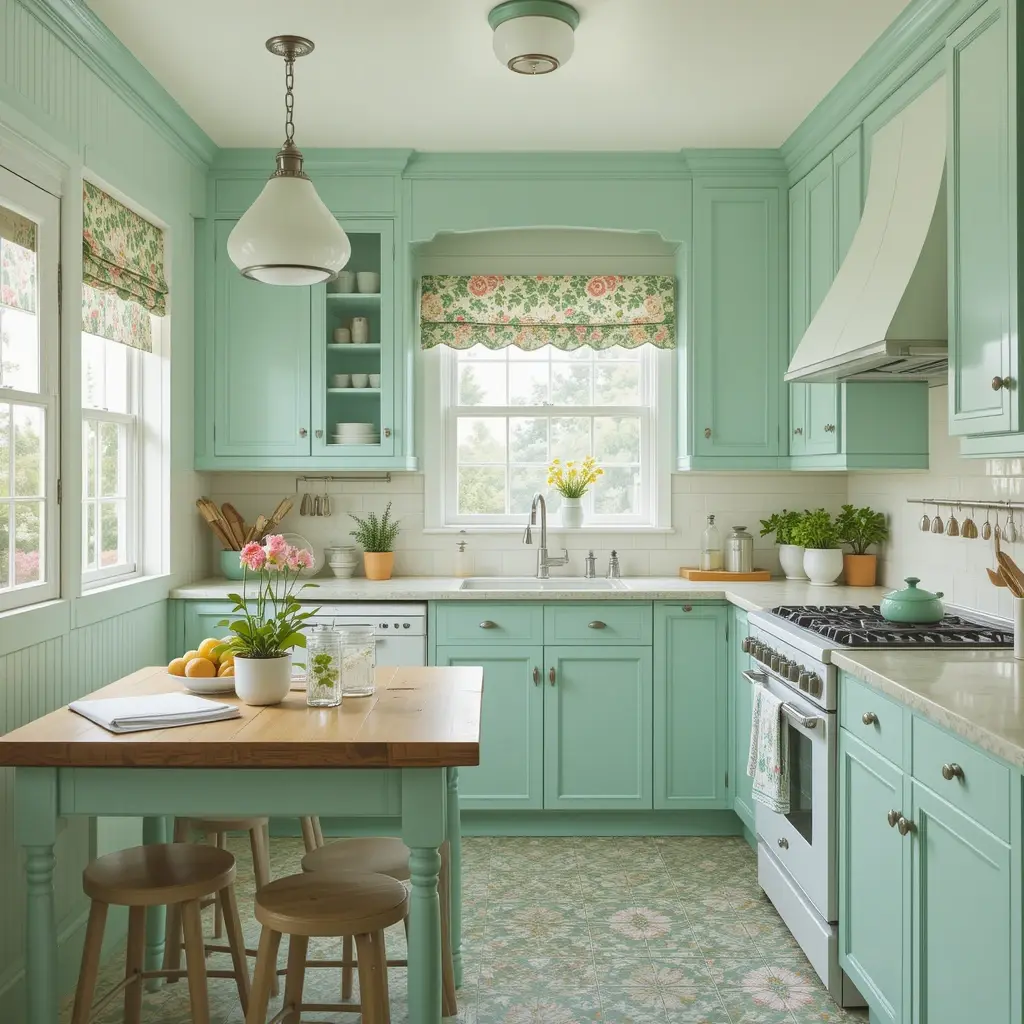 Mint green lends a fresh, playful vibe to your kitchen, perfect for a cheerful space. It works well with white or wood accents, creating a vintage or cottage-inspired look. Use it on cabinets, walls, or even accessories for a pop of color. This hue feels lively yet calming, making your kitchen a happy place to be. It’s especially charming in small or retro-style kitchens.