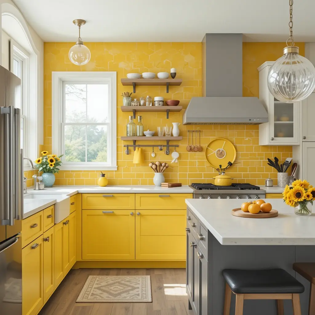 If you love a splash of cheerfulness, sunflower yellow is your go-to. It brings sunshine into your kitchen, energizing the space instantly. Think yellow lower cabinets or a vibrant backsplash that sparks joy. Pair it with crisp white or gray for balance, so the brightness doesn’t overpower. It’s a bold choice, but one that radiates warmth and positivity.