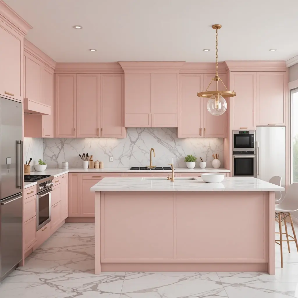 Blush pink softens your kitchen with a delicate, feminine touch. It’s a trendy hue that works well on cabinets or walls, especially when paired with marble or light wood. This color creates a warm, inviting atmosphere that’s both playful and sophisticated. Use it sparingly to avoid overwhelming the space, perhaps on a feature wall or island. It’s perfect for adding a subtle pop of color that feels fresh and modern.