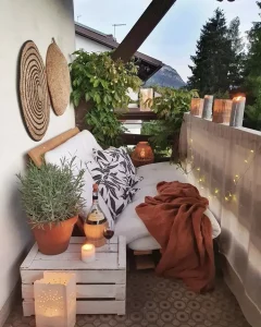 You can actually turn even the most negligible of balconies into a very appealing outdoor oasis; it’s all about the details, making the space work for you. Take this tiny balcony, for example. The owner intelligently used an outdoor futon, rendering the space an excellent place to lounge and relax. Every outdoor space has to have its share of greenery, bringing life to the place and offering freshness with the aura of nature around. And then, of course, there are those twinkle lights and candles. It’s like they take the atmosphere to a whole new level, so soft and magical in the evenings. I also love how the sheer curtain on the railing adds not only elegance but also privacy without blocking the fresh air and light. It is such a clever, simple way to make a small space feel a little more personal and inviting. This setting shows a perfect mix of comfort and style in a balcony design, with all its layers.