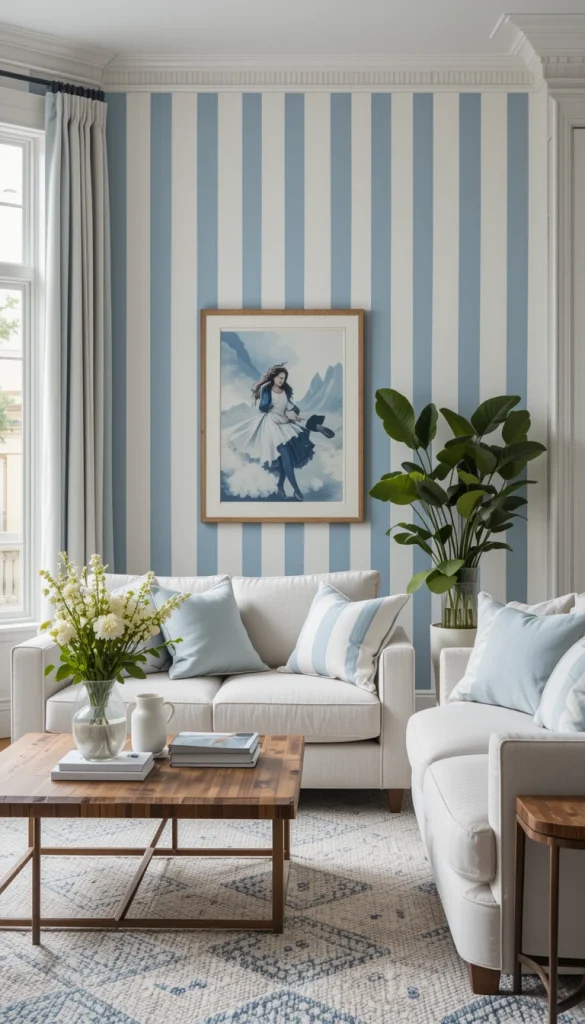 Dusty blue stripes add color without shouting. When paired with warm white, the living room feels calm, layered, and inviting. Vertical stripes help balance darker sofas or heavier furniture. This color combo suits both coastal and modern classic interiors. It feels thoughtful rather than trendy.